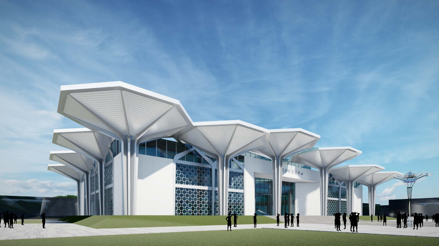 鄲城縣傘業(yè)產(chǎn)業(yè)園電子商務(wù)服務(wù)中心項目是鄲城縣傘業(yè)全產(chǎn)業(yè)鏈展銷的窗口項目、展示項目。會展中心的設(shè)計概念以“傘啟鄲興”為主題,基于對本土特色文化的深入解讀、同時結(jié)合“傘”的具體特征,提煉傘蓋、傘骨、傘柄的特殊形象為基本元素。建筑主立面以八個巨大傘形構(gòu)架依次展開,巨型的尺度、新穎的造型有極強的昭示性,裝飾幕墻八邊形的單元分割也隱喻了傘蓋的造型,創(chuàng)新的視覺形象為傘業(yè)產(chǎn)業(yè)園增加了新的注解。會展中心整體的建筑風格充分展示了鄲城傘業(yè)產(chǎn)業(yè)園的核心價值,形成獨具特色的地標形象。