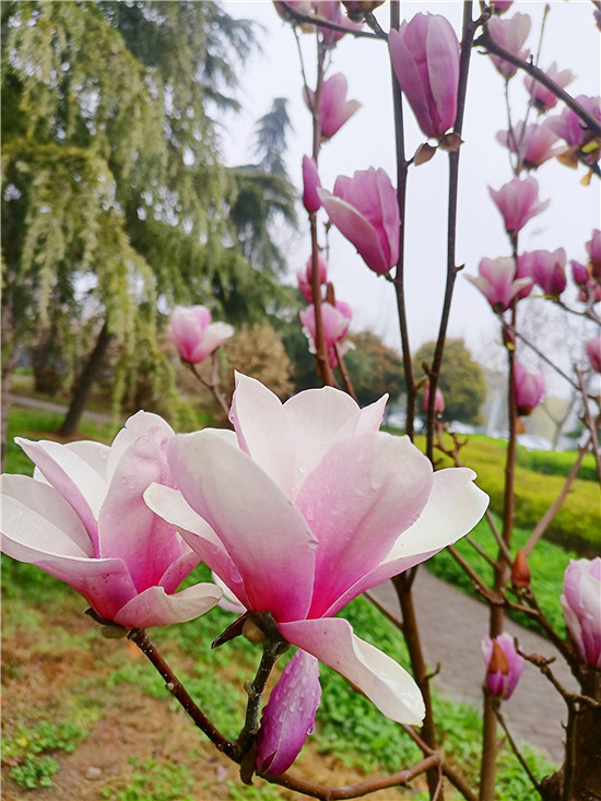“霓裳片片晚妝新,束素亭亭玉殿春。已向丹霞生淺暈,故將清露作芳?jí)m?!?月11日,我市下了一場(chǎng)小雨,路旁的紫玉蘭更顯晶瑩玉潤(rùn),朵朵玉蘭花如雨后新荷般清麗脫俗,或含苞待放、欲語(yǔ)還休,或花瓣盡展、舞姿翩翩,令人不禁駐足欣賞。