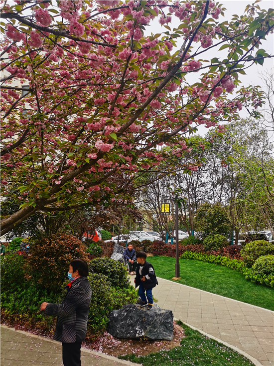 4月12日,中心城區(qū)文明路與七一路交叉口的街頭游園內(nèi),櫻花盛開,綠坪如茵,老人們在自娛自樂,很是幸福愜意。