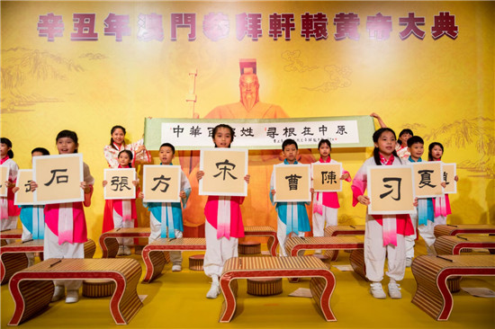 在儀程“高唱頌歌”環(huán)節(jié),30名澳門小學(xué)生身穿漢服,邊唱《黃帝頌》邊在小書桌上書寫毛筆字。隨后,孩子們舉起書寫的姓氏,后排兩名身穿漢服的老師打開“中華百家姓”卷軸,引來(lái)參加拜祖活動(dòng)的來(lái)賓陣陣掌聲。今年拜祖活動(dòng)現(xiàn)場(chǎng)組織了一個(gè)百人的漢服方陣,順應(yīng)流行的“國(guó)潮風(fēng)”,成為拜祖活動(dòng)的又一個(gè)亮點(diǎn)。