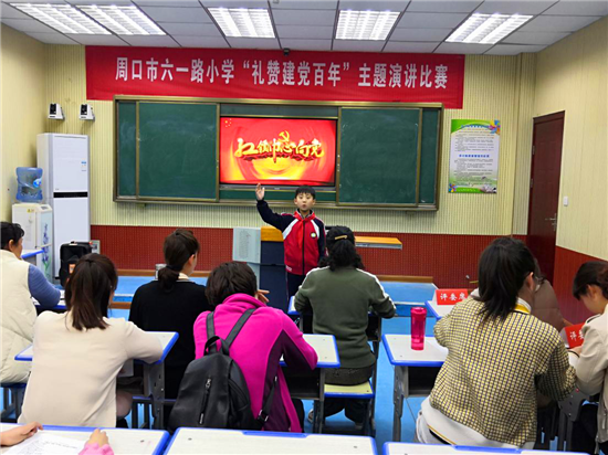 “中國(guó)共產(chǎn)黨是偉大的黨、崇高的黨、奮進(jìn)的黨,百年歷程、百年輝煌;沒(méi)有共產(chǎn)黨就沒(méi)有新中國(guó);我驕傲,我是中國(guó)人;我們要努力學(xué)習(xí)、奮發(fā)向上、為黨增光、為黨添彩……”周口市六一路小學(xué)舉辦“禮贊建黨百年”主題演講比賽,參賽選手回顧黨的光輝歷程、弘揚(yáng)黨的豐功偉績(jī),表達(dá)對(duì)中國(guó)共產(chǎn)黨的熱愛(ài)和贊頌,以各自獨(dú)特的見(jiàn)解給師生們進(jìn)行了一次生動(dòng)的理想信念教育。