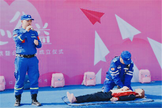 活動(dòng)現(xiàn)場(chǎng),藍(lán)天救援隊(duì)隊(duì)長(zhǎng)孟坤以多年救援經(jīng)驗(yàn),與隊(duì)員們互相配合,演示如何正確穿戴救生衣、如何正確實(shí)施心肺復(fù)蘇術(shù)等,還生動(dòng)演繹了當(dāng)學(xué)生遇到有人落水等突發(fā)情況,如何在保證自己不受傷害的情況下實(shí)施救援。
