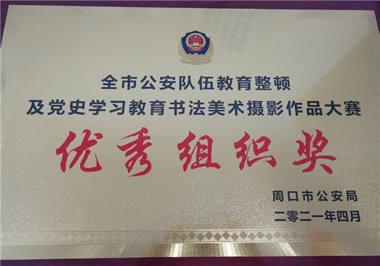 近日,扶溝縣公安局在全市公安隊伍教育整頓及黨史學習教育書法美術攝影作品大賽中榮獲優(yōu)秀組織獎,同時,該局推薦報送的多部書法攝影作品大賽中也榮獲多個獎項。其中,書法類榮獲一等獎1名、二等獎2名、三等獎1名、優(yōu)秀獎1名;美術類榮獲二等獎2名、三等獎4名;攝影類榮獲二等獎1名、三等獎1名。
