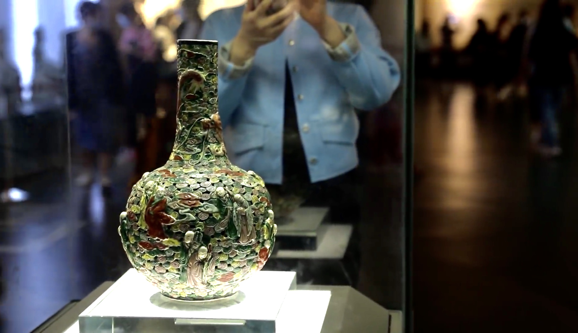 我是五彩透雕十八羅漢云龍瓶,又名古瓷流韻天球瓶。靜謐的空間里,我站在周口市博物館的玻璃展柜里,瞅瞅四周的兄弟姐妹,我偷偷笑了。雖沒有長睫毛和雙眼皮,但我可是個十足的“混血兒”。技藝精湛、圖案華貴、色彩艷麗,我的稀有性和珍貴性常常讓來訪者驚嘆不已。和青花瓷相比,我更加瑰麗多彩,人稱文物界的“米蘭·可兒”。