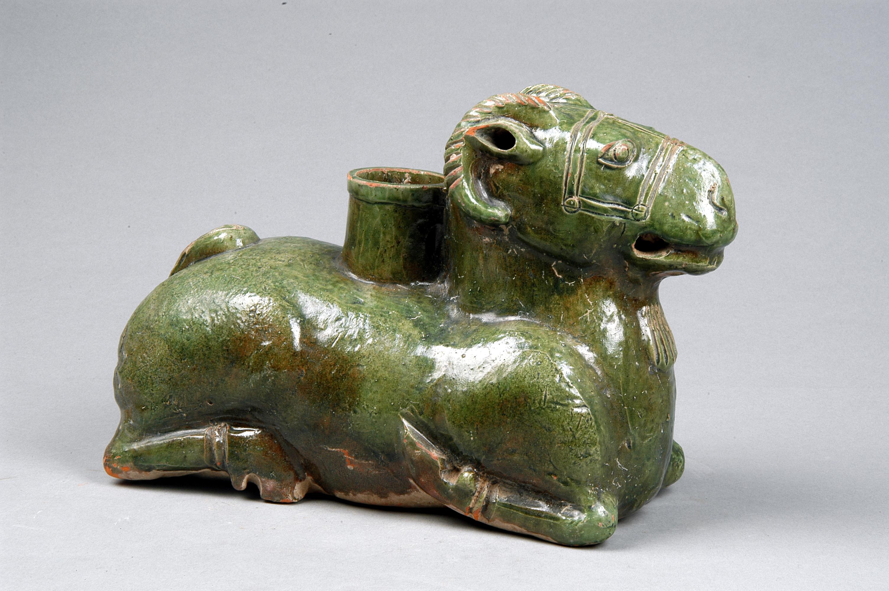 什么叫“尊”呢,就是你們現(xiàn)在說的酒杯。我就是用來喝酒的容器。關(guān)于造型呢,別期待我硬朗干練,我是寓意吉祥的一只小羊,是溫順善良的化身,線條流暢,神采奕奕。我身長36.6厘米,寬15.8厘米,高23厘米,口徑5.4厘米,臥姿跪地,嘴巴微張,紅陶質(zhì)地,綠釉作為裝飾色彩,遍布全身,釉色碧綠明凈,是漢代鉛釉陶中的珍品。