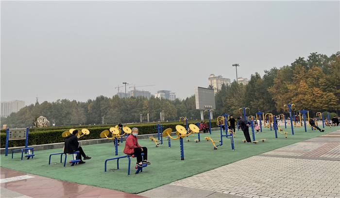 市民在市開發(fā)區(qū)人民廣場健身器材處鍛煉身體