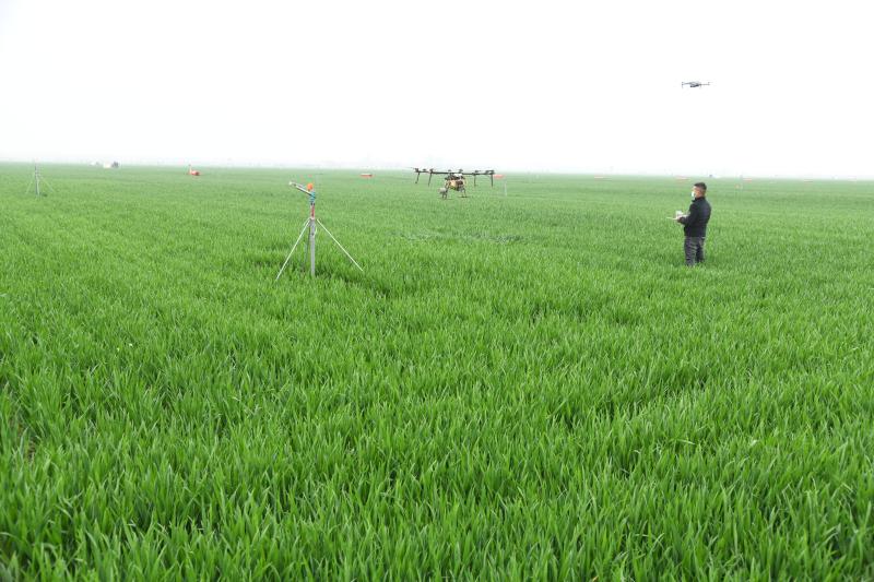 圖為商水縣高標準農田示范區(qū)內,技術人員在操作植保無人機噴灑農藥。