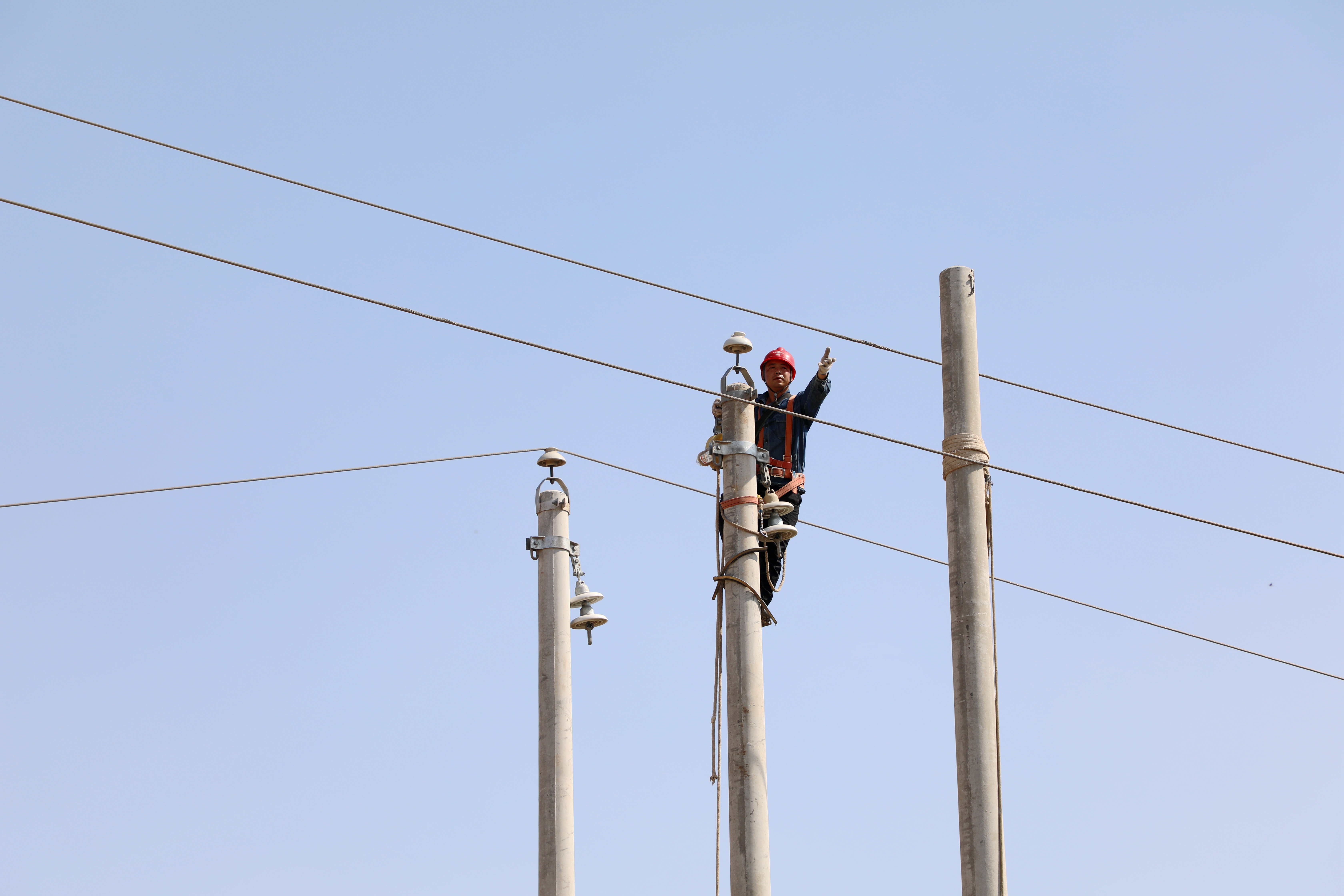 6月13日11時,天氣格外晴朗,烈日下氣溫突破38攝氏度。西華縣黃橋鄉(xiāng)潁河河堤上一片忙碌的景象,該縣供電公司搶修人員正在烈日下緊張有序地忙活著。