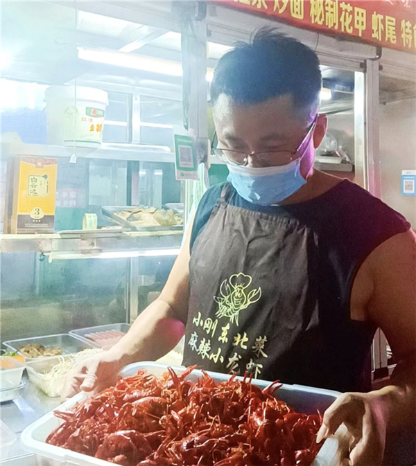 此時(shí),在“東北小剛”麻辣小龍蝦夜攤前,已經(jīng)擺放好了幾張桌子,三五成群的客人相繼前來(lái)落座??腿它c(diǎn)餐后,只見(jiàn)攤主“小剛”就站在操作臺(tái)前,手腳麻利地將提前準(zhǔn)備好的小龍蝦等菜品一一裝盤(pán),然后送到客人面前,忙得不可開(kāi)交。