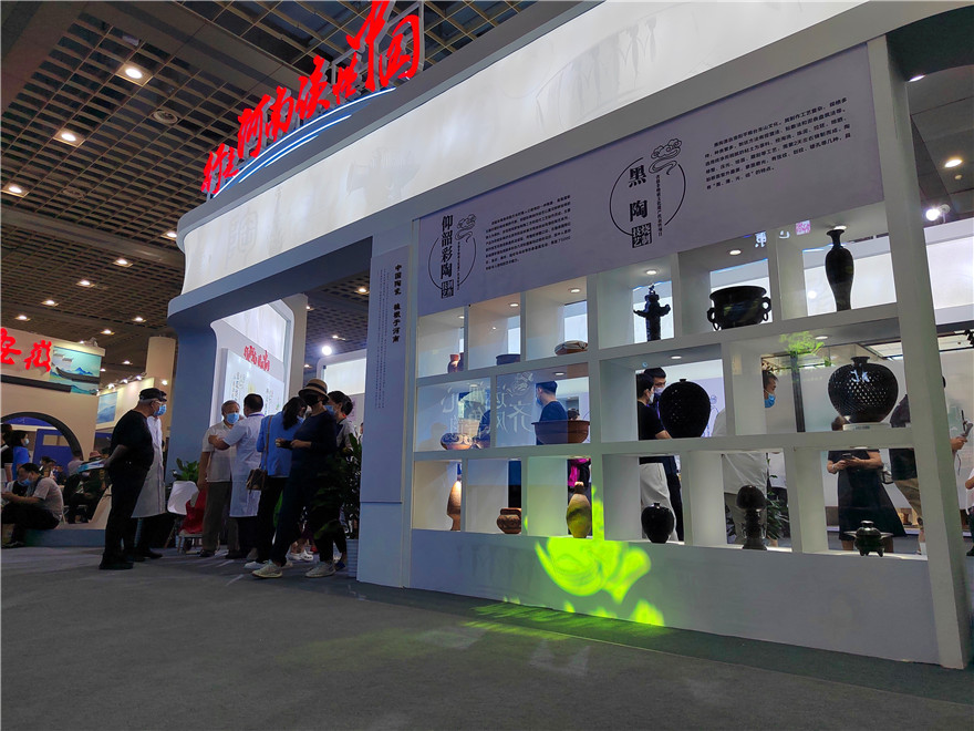 中國非物質(zhì)文化遺產(chǎn)博覽會,每兩年舉辦一屆,是非遺領(lǐng)域的全國性重要品牌活動,已成為展示非遺保護(hù)成果、宣傳非遺保護(hù)理念、引領(lǐng)非遺保護(hù)工作的重要平臺。本屆非物質(zhì)文化遺產(chǎn)博覽會為期5天,河南省有16個(gè)非遺項(xiàng)目、4個(gè)非遺美食企業(yè)參展,布置在文化底蘊(yùn)深厚的“行走河南·讀懂中國”展區(qū)。淮陽黑陶、仰韶彩陶、唐三彩、魯山窯、汝瓷、鈞瓷、登封窯、當(dāng)陽峪絞胎瓷、澄泥硯、??h泥咕咕燒制技藝在展廳一一亮相?;搓柡谔諢萍妓囀〖墏鞒腥藦堓x攜帶的部分作品以大氣、精美的文化底蘊(yùn)深深吸引著人們觀賞,各派非遺戲曲傳人也紛紛捧起他的黑陶作品展示中原古老的黑陶藝術(shù)文化。②15