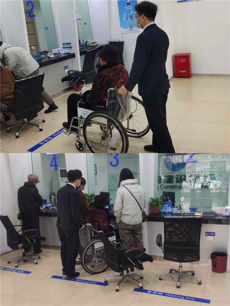 3月27日上午11點左右,項城蓮花大道支行大堂經理張云磊在門口引導客戶時,發(fā)現(xiàn)兩位客戶扶著另一位客戶走進網點。注意到客戶雙腿行走不便,他立即推來輪椅,把客戶扶到輪椅上。三位客戶不熟悉銀行辦業(yè)務流程,大堂經理張云磊全程跟隨指導辦理業(yè)務。經詢問,大堂經理得知客戶前來辦理社??せ顦I(yè)務,以便領取殘疾人補貼。大堂經理立即幫他安排綠色通道,幫助家屬推輪椅到柜臺辦理,在一旁指導客戶填單跟簽名。