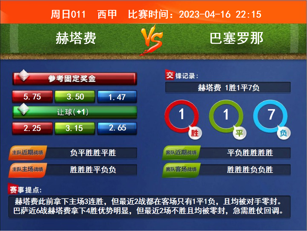 賽事提點:赫塔費此前拿下主場3連勝,但最近2戰(zhàn)都在客場只有1平1負,且均被對手零封。巴薩近6戰(zhàn)赫塔費拿下4勝優(yōu)勢明顯,但最近2場不勝且均被零封,急需勝仗回調。