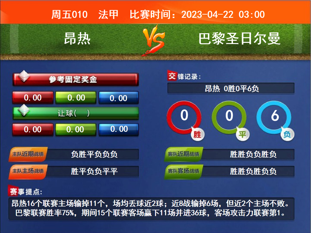 比賽時間:2023-04-22 03:00賽事提點:昂熱16個聯(lián)賽主場輸?shù)?1個,場均丟球近2球;近8戰(zhàn)輸?shù)?場,但近2個主場不敗。巴黎聯(lián)賽勝率75%,期間15個聯(lián)賽客場贏下11場并進36球,客場攻擊力聯(lián)賽第1。