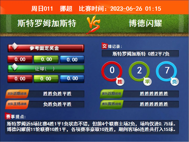 比賽時間:2023-06-26 01:15賽事提點:斯特羅姆近6場比賽4勝1平1負狀態(tài)不錯,但前4個聯(lián)賽主場2負,場均僅進0.75球。博德閃耀前11輪聯(lián)賽10勝1平,各項賽事豪取10連勝,期間客場6連勝共打入15球。