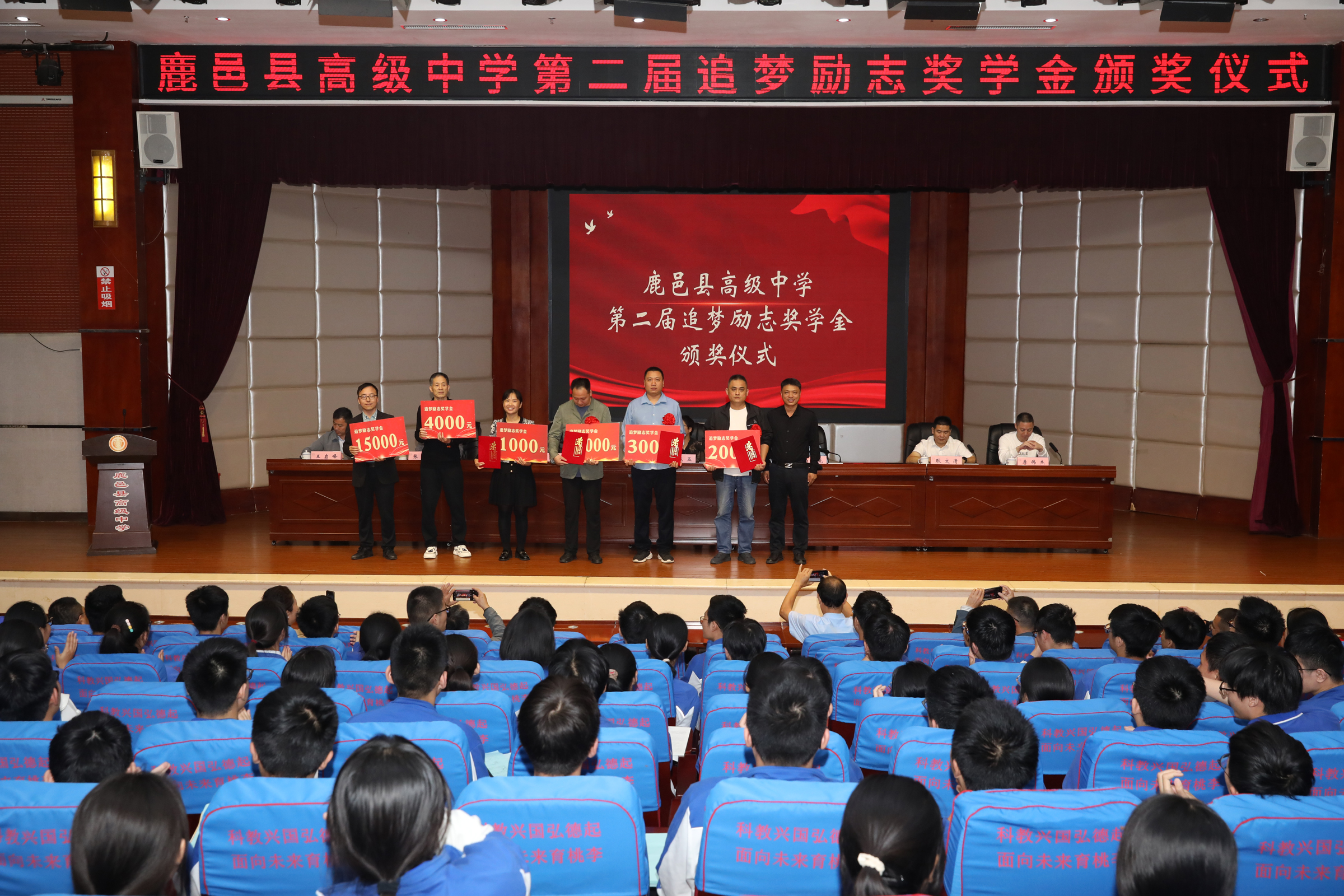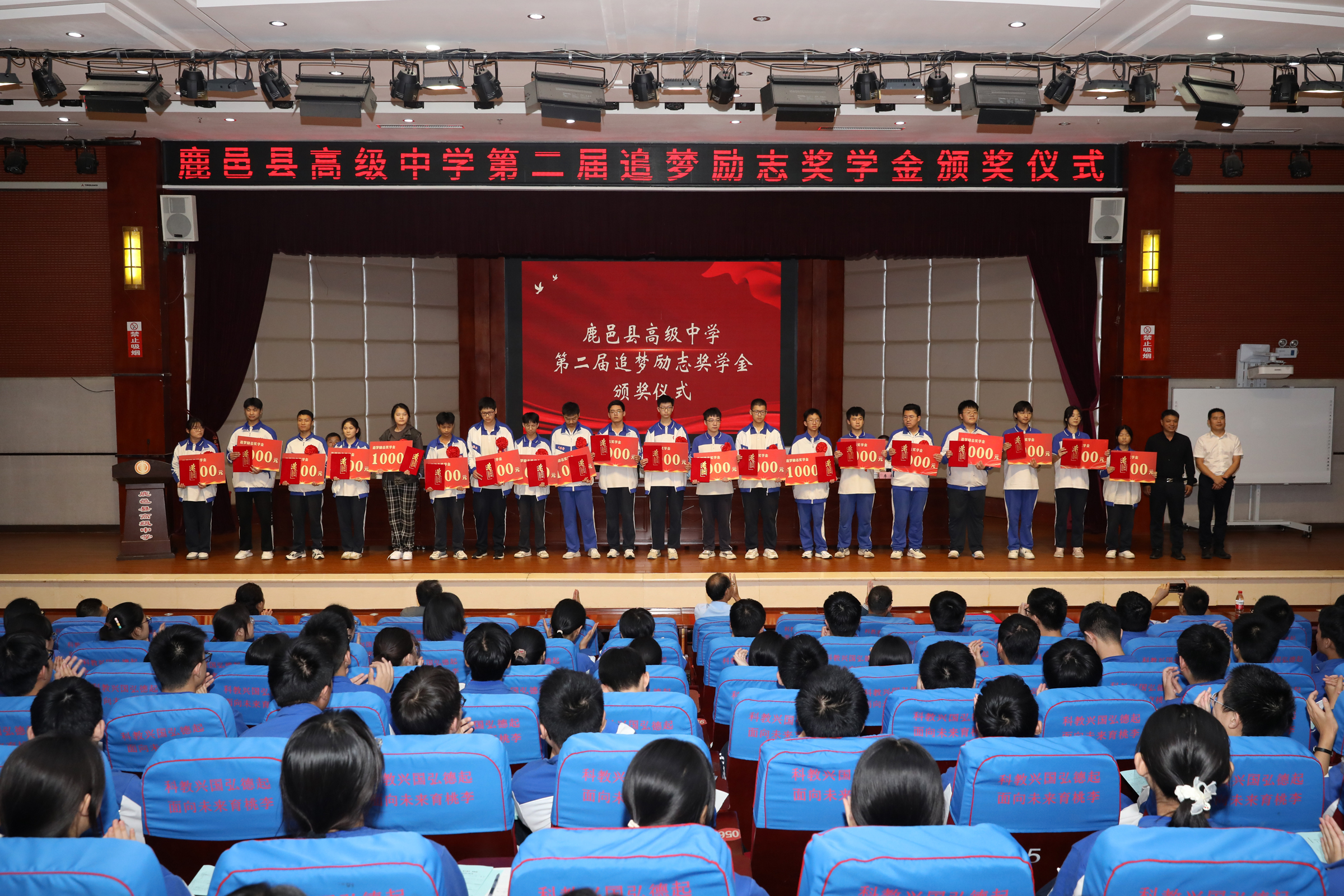據(jù)了解,鹿邑縣高級中學(xué)追夢勵志獎學(xué)金是2022年由優(yōu)秀校友、暨南大學(xué)教授王高賀發(fā)起,部分校友和社會愛心人士自愿捐贈資金,在學(xué)校設(shè)立的勵志獎學(xué)金,用于獎勵母校優(yōu)秀的學(xué)生和教師團隊。此次頒獎儀式共頒發(fā)獎學(xué)金11萬元,周樂樂、張逍遙等40位同學(xué)和高小飛、毛東方等6個班級教師團隊獲得追夢勵志獎學(xué)金。在2023年高考中,陳孟康同學(xué)被北京大學(xué)飛行員班錄取,北清部全體教師獲得3萬元名校獎。