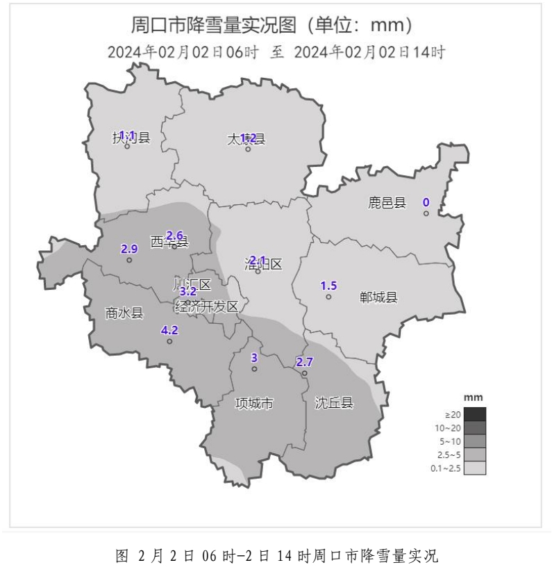 今天06時(shí)﹣14時(shí):我市出現(xiàn)小到中雪天氣。最大降雪量出現(xiàn)在商水 4. 2 毫米,全市平均降雪量2.3 毫米。各國(guó)家站降雪量(毫米):商水4.2、川匯區(qū)3.2、沈丘3.1、項(xiàng)城3.0、黃泛區(qū)2.9、西華2.6、淮陽(yáng)2.1、鄲城1.5、太康1.2、扶溝1.1、鹿邑0.1。