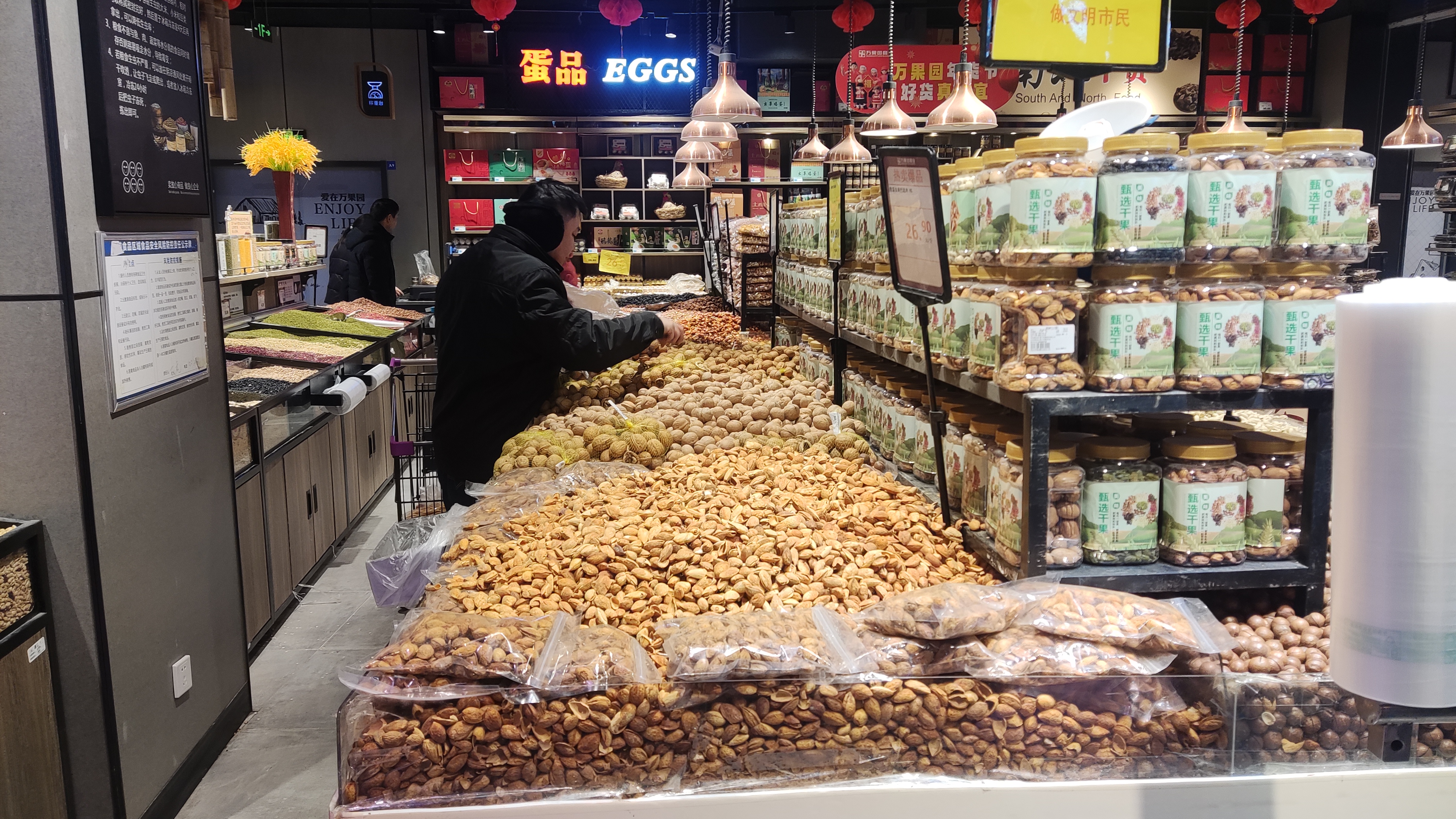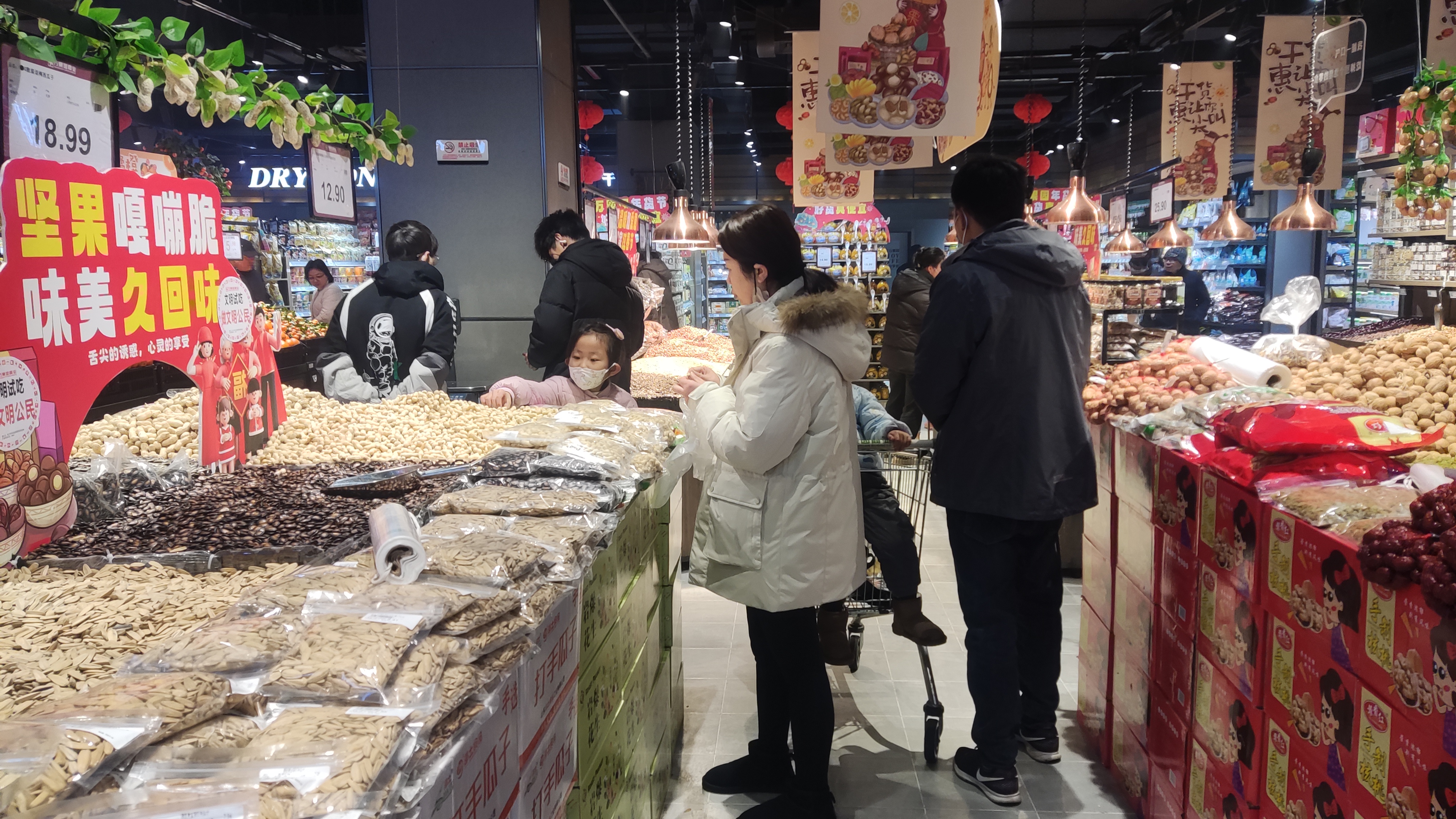 核桃、巴旦木、夏威夷果、碧根果……市民陳女士拎著一大包商品滿載而歸?!俺詧?jiān)果健康又養(yǎng)生,家里人都喜歡吃,過年期間一家人邊聊天邊吃堅(jiān)果,滿滿年味?!标惻空f,組合裝小袋堅(jiān)果比較劃算,里面有剝好的杏仁、核桃、腰果等,價(jià)格不貴,方便實(shí)惠。
