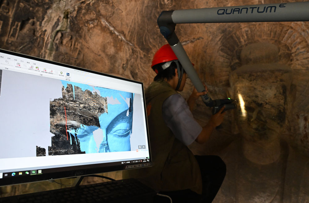 2025年4月9日,武漢大學文化遺產智能計算實驗室團隊成員在魏字洞使用關節(jié)臂掃描儀對佛像進行數(shù)字化掃描。圖片來源新華社