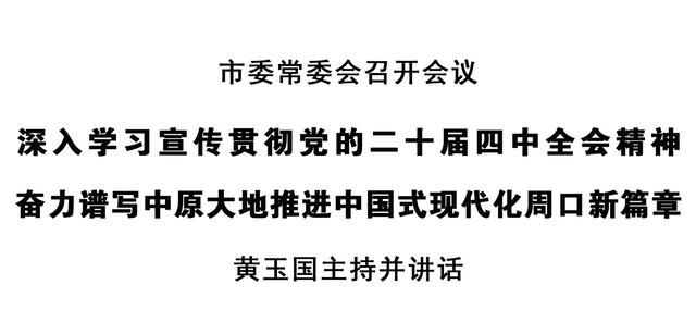 會(huì)議強(qiáng)調(diào),要把學(xué)習(xí)宣傳貫徹黨的二十屆四中全會(huì)精神,作為各級(jí)黨委(黨組)理論學(xué)習(xí)中心組集體學(xué)習(xí)的重要內(nèi)容,納入黨校(行政學(xué)院)教育培訓(xùn)的必修課程,做到黨員干部全覆蓋;各級(jí)宣傳部門要充分利用各種形式和手段,做好權(quán)威解讀和分眾化傳播,讓廣大黨員干部群眾聽(tīng)得懂、記得住、落實(shí)在行動(dòng)上;要把貫徹落實(shí)全會(huì)精神與習(xí)近平總書(shū)記在河南考察時(shí)重要講話精神緊密結(jié)合起來(lái),聚焦“兩高四著力”,錨定“1+2+4+N”目標(biāo)任務(wù)體系,落實(shí)市委“16232”總體工作思路,突出抓好重點(diǎn)項(xiàng)目建設(shè)和招商引資、農(nóng)業(yè)農(nóng)村、城市規(guī)劃建設(shè)管理、文旅發(fā)展、民生實(shí)事、社會(huì)治理等重點(diǎn)工作,全力以赴打贏“十四五”收官戰(zhàn),高質(zhì)量編制“十五五”規(guī)劃,切實(shí)把全會(huì)部署轉(zhuǎn)化為推動(dòng)現(xiàn)代化周口建設(shè)的實(shí)際行動(dòng)。