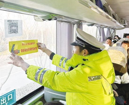 2月2日,周口交警為客車貼上溫馨提示條。2026年春運(yùn)大幕正式拉開,為期40天的春運(yùn)安保工作同步全面啟動(dòng)。