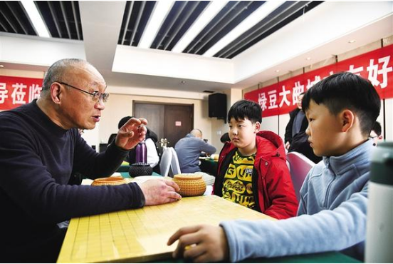 11月22日上午,一位老棋手同時(shí)對(duì)弈兩個(gè)娃娃棋手,幫助娃娃們提高棋藝。當(dāng)日,在河南省圍棋協(xié)會(huì)的支持下,由周口市圍棋協(xié)會(huì)主辦的“鄭州、南陽(yáng)、周口三市圍棋交流賽”在周口舉行。