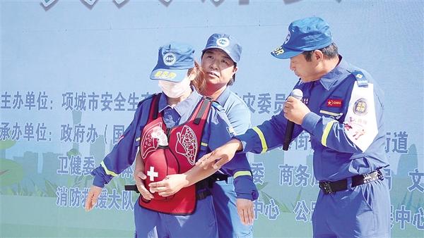 6月16日,項(xiàng)城市舉行“安全宣傳咨詢?nèi)铡被顒?dòng)。活動(dòng)設(shè)置警示教育片展播、應(yīng)急技能演示、救援裝備展示、安全咨詢等環(huán)節(jié)。圖為項(xiàng)城應(yīng)急藍(lán)天救援隊(duì)3名隊(duì)員演示海姆立克急救法操作流程。