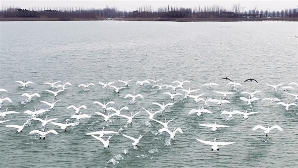 近日,市城鄉(xiāng)一體化示范區(qū)引黃調(diào)蓄湖迎來一批北飛回遷的天鵝。這群天鵝或逐日飛翔,或踏水而歌,或悠閑覓食,盡情享受遷徙途中的休閑時光,吸引眾多群眾前來觀賞。