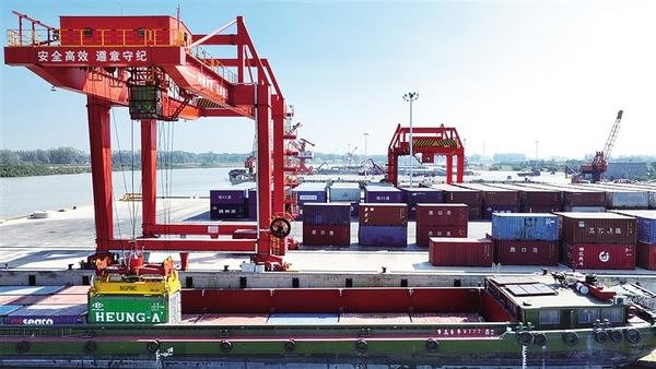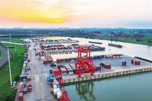 作為國(guó)家重點(diǎn)建設(shè)的36個(gè)內(nèi)河港口之一,目前,周口中心港已建成投用47個(gè)千噸級(jí)泊位,年吞吐能力達(dá)3000萬(wàn)噸,開(kāi)通18條國(guó)內(nèi)集裝箱航線及14條國(guó)際集裝箱航運(yùn)通道,實(shí)現(xiàn)了“箱通世界、貨運(yùn)全球”。圖為記者近日拍攝的周口中心港碼頭集裝箱裝船作業(yè)現(xiàn)場(chǎng)。