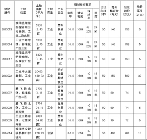 備注:1.2013013、2013014、2013017、2013022、2013037、2013038、2013039宗地位于產(chǎn)業(yè)集聚區(qū)內(nèi),屬兩層以上標(biāo)準(zhǔn)化廠房建設(shè)用地,投資強(qiáng)度≥3750萬元/公頃。地上有部分違法建筑物,經(jīng)政府辦、發(fā)改委、財政局、監(jiān)察局、法制辦、住建局、審計局、房產(chǎn)辦、規(guī)劃辦、城市綜合執(zhí)法局和縣產(chǎn)業(yè)集聚區(qū)管委會集體研究,地上建筑不再作價與土地捆綁出讓,由土地競得人無償處置地上建筑物。土地出讓合同簽訂后,8個月內(nèi)必須開工建設(shè),工期24個月,土地成交價款需在土地出讓合同簽訂后60日內(nèi)繳清,交地時間在3個月內(nèi)。