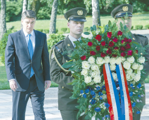 ⑤5月9日,在克羅地亞首都薩格勒布,克總理米拉諾維奇(左)在紀(jì)念反法西斯戰(zhàn)爭(zhēng)勝利70周年的活動(dòng)中向人民英雄紀(jì)念碑敬獻(xiàn)花圈。新華社發(fā)