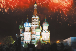 ?、?月9日,禮花在俄羅斯首都莫斯科紅場(chǎng)上空綻放。