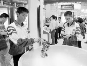 全國教育信息化應(yīng)用展覽在青島舉行 5月24日,兩名中學(xué)生在展覽上體驗(yàn)操作機(jī)器人。由教育部、聯(lián)合國教科文組織、中國聯(lián)合國教科文組織全委會主辦,青島市人民政府承辦的全國教育信息化應(yīng)用展覽,于5月23日至25日在青島舉辦。新華社記者 張旭東 攝