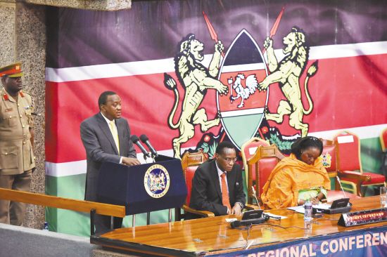 肯尼亞舉辦地區(qū)會議呼吁國際社會合作反恐 6月27日,在肯尼亞內(nèi)羅畢,肯尼亞總統(tǒng)肯雅塔(左)在地區(qū)會議上致閉幕辭??夏醽喺?5日至27日在首都內(nèi)羅畢舉辦地區(qū)會議,探討如何應(yīng)對暴力極端主義和恐怖活動,并呼吁國際社會合作反恐。(本欄文圖均據(jù)新華社發(fā))