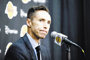 當(dāng)?shù)貢r(shí)間3月24日,納什在新聞發(fā)布會(huì)上。當(dāng)日,洛杉磯湖人隊(duì)球員斯蒂夫·納什召開新聞發(fā)布會(huì),就退役一事回答記者提問(wèn)。納什于21日通過(guò)網(wǎng)絡(luò)宣布了自己退役的消息。新華社發(fā)